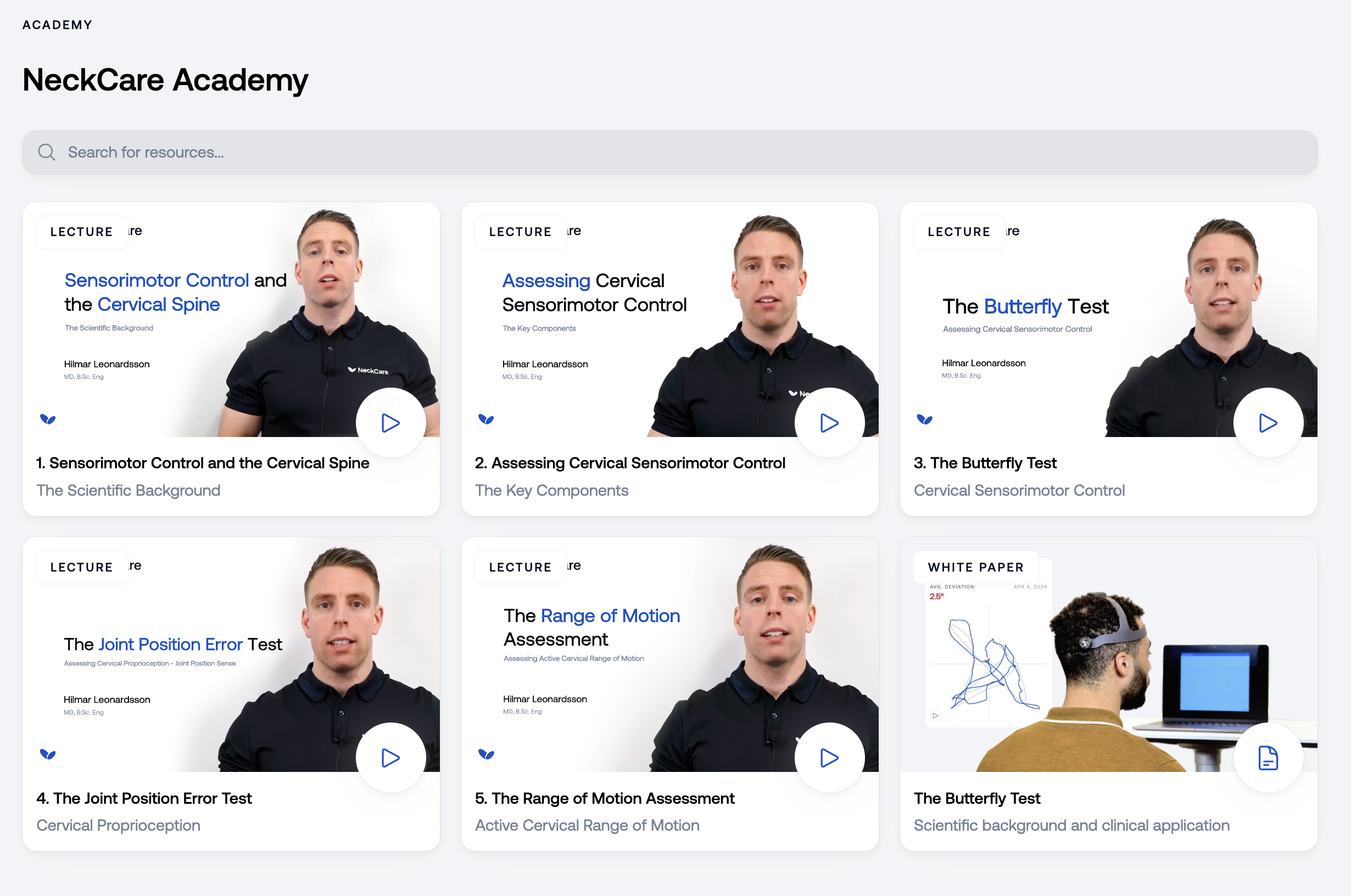 The Academy features video lectures and written resources offering scientific and clinical guidance, developed by NeckCare in collaboration with the NeckCare Clinical Advisory Board